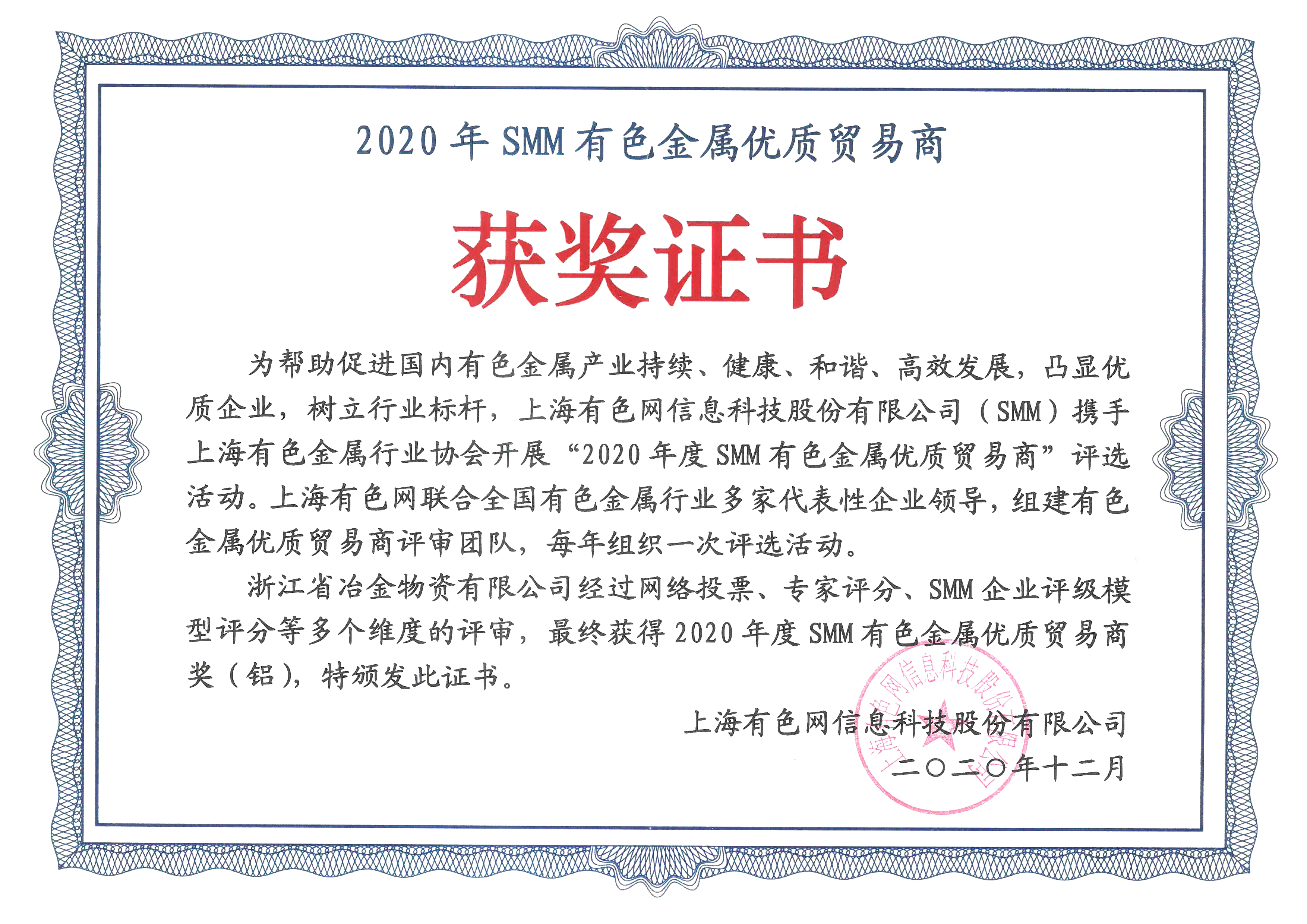 據了解,上海有色網為幫助促進國內有色金屬產業持續、健康、和諧、高效發展,凸顯優質企業,樹立行業標桿,攜手上海有色金屬行業協會開展“2020年度SMM有色金屬優質貿易商”評選活動,并聯合山東鋁業協會、上海礦業全產業鏈服務創新聯盟等單位組建評審團隊。經過網絡投票、專家評分、SMM企業評級模型評分等多個維度的綜合評審,冶金物資最終在全國眾多貿易商中脫穎而出,獲得2020年度SMM有色金屬優質貿易商獎(鋁)。